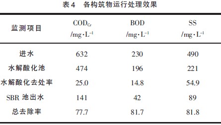 廢水處理工程經(jīng)過兩個多月的調(diào)試運行后, 各項出水指標(biāo)均達到設(shè)計要求。各構(gòu)筑物運行處理效果見表4。