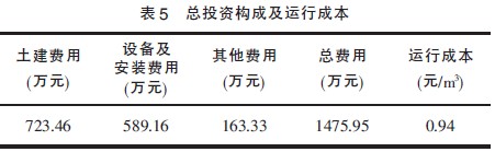 工程總占地面積2.75 萬m2, 工程總投資1475.95 萬元。由于該廢水中成分比較復(fù)雜, 該工程設(shè)備、安裝材料均考慮防腐, 造成工程投資增大?偼顿Y構(gòu)成及運行成本見表5。