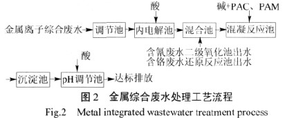 針對(duì)最后出水銅元素有超標(biāo)現(xiàn)象的情況,對(duì)原水水質(zhì)重新進(jìn)行了化驗(yàn)、檢測(cè)、分析,認(rèn)為5 路廢水中含銅的有2 路,其中含氰廢水水量相對(duì)較小。檢測(cè)結(jié)果表明,氰的氧化比較徹底,而金屬綜合廢水的水量較大,廢水來源復(fù)雜,車間生產(chǎn)以手工勞動(dòng)為主,廢水分離工作不夠徹底,除了以自由離子方式存在外,銅還可能以絡(luò)合狀態(tài)存在,而現(xiàn)有工藝沒有對(duì)這部分以絡(luò)合狀態(tài)存在的銅離子采取破絡(luò)措施。經(jīng)過多次試驗(yàn),對(duì)金屬綜合廢水處理工藝做如圖2 改進(jìn)。