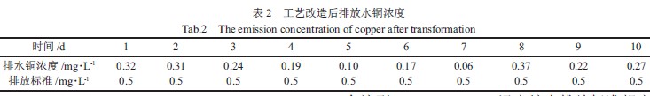金屬綜合廢水增加內(nèi)電解處理工藝。通過對(duì)比和參考類似廢水處理工程[12-13]的反應(yīng)條件,決定內(nèi)電解池反應(yīng)條件為:pH 3~4,反應(yīng)水力停留時(shí)間90 min,填料為鐵刨花和焦炭與活性炭的混合物,鐵炭比m (Fe):m(C)=4:1。為使反應(yīng)完全,節(jié)省日常運(yùn)行費(fèi),內(nèi)電解池出水采取部分循環(huán)回內(nèi)電解池的進(jìn)口端。改進(jìn)后,連續(xù)10d 的銅的排放指標(biāo)見表2?梢钥闯,增加內(nèi)電解工藝后,銅的排放濃度[Cu]max=0.37 mg·L-1,[Cu]min=0.06 mg·L-1,[Cu]ave=0.252 mg·L-1,完全達(dá)到GB 8978-1996 污水綜合排放標(biāo)準(zhǔn)規(guī)定的一級(jí)排放標(biāo)準(zhǔn)[14]。