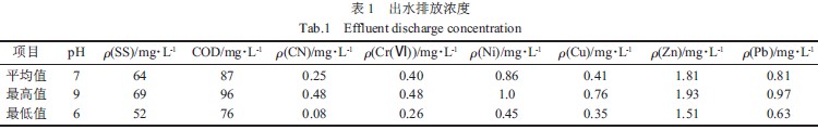 設(shè)計(jì)出水水質(zhì)按照污水綜合排放標(biāo)準(zhǔn)(GB 8978-1996)一級(jí)標(biāo)準(zhǔn),具體指標(biāo)值為:pH 為6~9, COD 100 mg·L-1,SS 質(zhì)量濃度70 mg·L-1,CN 質(zhì)量濃度0.5 mg·L-1,Cr(Ⅵ) 質(zhì)量濃度0.5 mg·L-1,Ni 質(zhì)量濃度1.0 mg·L-1,Cu 質(zhì)量濃度0.5 mg·L-1,Zn 質(zhì)量濃度5.0 mg·L-1,,Pb 質(zhì)量濃度1.0 mg·L-1。