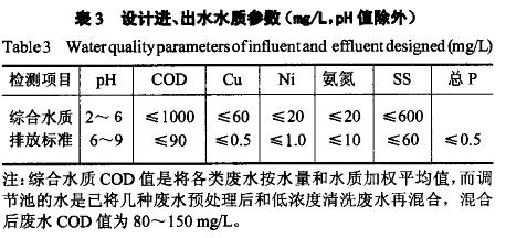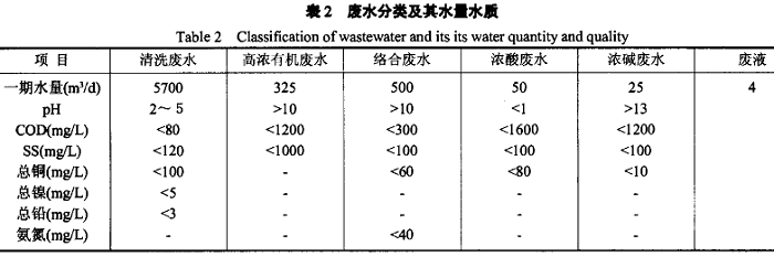 該廠主要廢水分類和水量見表2。PCB廢水的主要污染物是酸、堿、Cu、Ni等重金屬離子,以及 COD、SS等等。該廢水經(jīng)處理后,出水水質(zhì)達(dá)到廣東省《水污染排放限值(DB44/26.2001)》中的II時(shí)段一級(jí)排放標(biāo)準(zhǔn),見表3。
