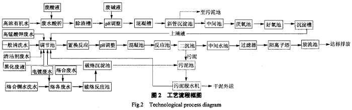 根據(jù)廢水的水質(zhì)特點(diǎn),不同生產(chǎn)工序排出的廢水分別收集到不同的廢水貯槽(池)內(nèi)。并分別對(duì)各類廢水進(jìn)行預(yù)處理后再合并一起處理。該廠處理系統(tǒng)主要的設(shè)計(jì)工藝如圖2。