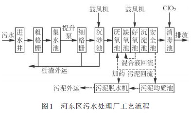 河東區(qū)污水處理廠綜合考慮經濟、技術、環(huán)境、投資等因素,主體工藝采用Biolak型A2/O工藝,工藝流程見圖1。