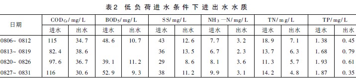 河東區(qū)污水處理廠運行初期,由于污水管網覆蓋率和收集率較低,導致實際進廠水量僅為設計規(guī)模的1/3左右且進水不均勻程度高,因此會大幅度延長污水在廠內構筑物和管路中的停留時間。同時進水有機營養(yǎng)源嚴重不足,致使進水水量水質負荷明顯偏低,且低有機負荷率易發(fā)生污泥膨脹現(xiàn)象。針對此種實際情況,我們經過反復的摸索,采取了風機變頻間歇運行的方式,減少向好氧池的供氣量,避免低負荷時產生過氧化現(xiàn)象;混合液回流泵維護性運行的方式,降低溶解氧帶入缺氧池的概率,保持缺氧池的缺氧狀態(tài);二沉池回流泵自控間歇運行的方式,減少二沉池泥水分離時的擾動因素,強化分離效果改善出水水質等的系列措施,使整個系統(tǒng)保持低負荷運行狀態(tài)。不但實現(xiàn)了工藝的穩(wěn)定運行和水質達標排放,而且降低了處理電耗。污水處理廠2007 年8月的處理效果如表2所示。