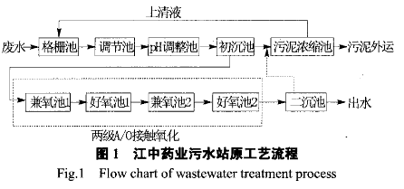廠方主要產(chǎn)品為健胃消食片、復(fù)方草珊瑚含片。中成藥主要生產(chǎn)過程為:中藥原材料切片煎煮、濃縮為浸膏,經(jīng)噴霧干燥后制成干膏粉,再與輔料按比例混合后壓片、薄膜包衣成型。廢水主要來源于提取車間的原料濃縮廢液、煎煮濃縮容器清洗水、噴霧干燥塔清洗水和多功能車間壓片、包衣容器清洗,各車間地面沖洗水及人員清潔用水也一并混入生產(chǎn)廢水。另外生化車間利用干蚯蚓提取蚓激酶,水泡磨漿和離心過濾中都有廢液產(chǎn)生,同時(shí)提取樹脂再生用酸堿溶液也直排進(jìn)入污水管道,雖然產(chǎn)量不大,但在其他車問廢水量小時(shí)會(huì)對(duì)廢水pH造成較大影響。
