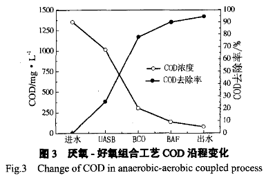 穩(wěn)定運(yùn)行期間厭氧.好氧工藝沿程COD變化如圖3所示。