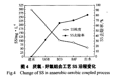 初沉池沉淀、調(diào)節(jié)池水解酸化能有效降低厭氧反應(yīng)器進(jìn)水SS濃度;UASB反應(yīng)器通過污泥床層截留和三相分離器沉降共同減少出水SS;接觸氧化出水經(jīng)過二沉池沉淀和BAF過濾后最終實(shí)現(xiàn)SS達(dá)標(biāo)排放。在工藝平均進(jìn)水SS 300 mg/L。時(shí),總出水SS 平均為56 mg/L,SS的去除率達(dá)到81.1%,處理效果良好。組合工藝SS沿程變化見圖4。