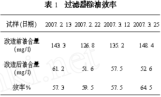 為解決除焦油器除油效率低的現(xiàn)象,盡可能的減少生化進水的油含量, 2006年,我廠對剩余氨水除油系統(tǒng)進行了改造,引進了高效的微孔陶瓷過濾器, 裝置投入使用后,運行一直比較穩(wěn)定,除油效率達到了60% ,雜質(zhì)去除率達到90% ,解決了剩余氨水含油高的難題。過濾除油效率見表1: