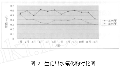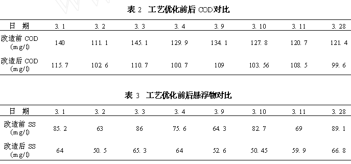 經(jīng)過對進出水系統(tǒng)的工藝優(yōu)化,整個生化處理裝置運行比較穩(wěn)定,在控制好進水水質(zhì)的前提下,缺氧池、好氧池的回流量、空氣量以及溫度基本維持不變,營養(yǎng)物投加量增加了5% ,生化出水指標取得了明顯的好轉(zhuǎn), COD 和懸浮物含量大幅度降低(見表 2、表3) ,最難達標的氰化物也順利達到了二級排放標準, 處理效率好的時候出水氰含量達到了 0. 33mg/ l。圖2為工藝優(yōu)化前后氰的出水指標對比圖: