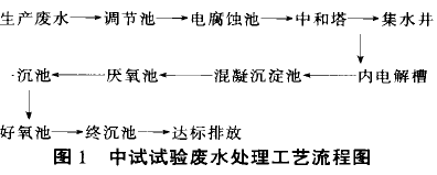 生產(chǎn)廢水本身含有機(jī)質(zhì)較多,濃度較高,COD 最高為23520 mg/l,而且酸度大、毒性高,不能直接進(jìn)行生化處理。因此,中試試驗(yàn)采用物化與生化相結(jié)合的工藝,即電腐蝕-中和反應(yīng)-內(nèi)電解-混凝沉淀-厭氧-好氧工藝(見(jiàn)圖1)。