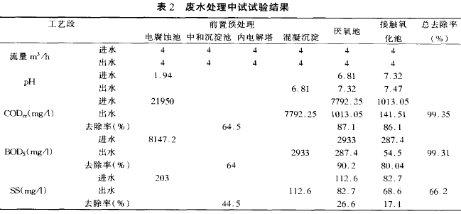 廢水處理中試試驗(yàn)結(jié)果見(jiàn)表2。