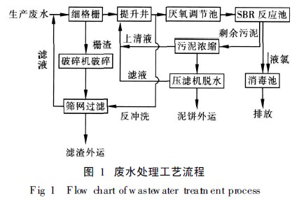 該工藝具有如下特點: ① 由于廢水中SS較高, 且SS主要為含水量較高的蔬菜莖、葉等物質(zhì), 而SBR工藝對進水水質(zhì)要求較低[ 2、3 ] , 故僅在提升泵前設(shè)置了一道細格柵, 同時為了降低運送出廠的污染物總量, 在格柵除污機上安裝了機械破碎裝置, 將破碎后的格柵攔截物(如蔬菜莖、葉等)經(jīng)篩網(wǎng)再次過濾后送至柵前進水口。工程運行后的測試結(jié)果表明, 柵渣經(jīng)機械破碎、篩網(wǎng)過濾后總體積為直接外運的20%左右, 大大降低了柵渣總量。② 由于進水水溫較高, 對SBR 池的曝氣效率產(chǎn)生不利影響, 同時為了解決廢水水量、水質(zhì)不均問題, 在SBR 池前設(shè)置了厭氧降溫調(diào)節(jié)池, 充分利用廢水中的熱量進行中溫厭氧消化, 利用厭氧菌去除進水中的部分有機物以降低SBR池的有機負荷, 同時降低水溫, 提高后續(xù)SBR池的供氧效率。在調(diào)節(jié)池內(nèi)設(shè)攪拌水泵, 使厭氧污泥處于懸浮狀態(tài)以加強處理效果和防止污泥沉淀。③ 廢水溫度較高, 極易腐敗酸化[ 4] , 廢水排出車間后在管道內(nèi)流動過程中即已變酸, 當(dāng)?shù)竭_廢水處理廠時, pH 值可達到5左右。為了防止SBR 反應(yīng)池出現(xiàn)酸化現(xiàn)象, 在SBR 反應(yīng)池前設(shè)置了 NaOH 投加裝置, 以調(diào)節(jié)廢水的pH。④由于SBR工藝具有運行穩(wěn)定性好、抗沖擊能力強、防止污泥膨脹等優(yōu)點[ 5] , 好氧部分采用了SBR 工藝。⑤ 剩余活性污泥經(jīng)重力濃縮池濃縮后, 利用板框式壓濾機脫水, 泥餅外運。