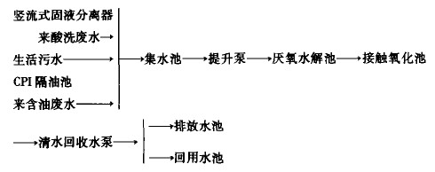 拆除原一體化生活污水處理裝置,新建生活污水處理回用系統(tǒng),其處理量為40 m /h,將酸洗廢水和含油廢水排人生活污水處理裝置,與生活污水一起進(jìn)行生化處理,增加必須的處理設(shè)備。處理合格的廢水后送至煤場(chǎng)作補(bǔ)充水,或直接排人總的廢水排放池。
