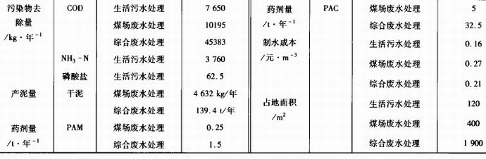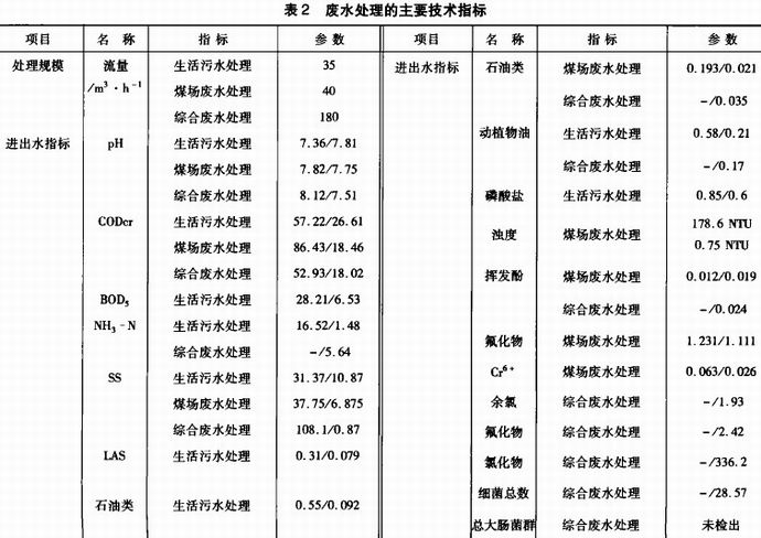 注:生活污水處理量為30—35 m /h,年運(yùn)行360天,24 h連續(xù)處理。年處理量25~30萬(wàn)m ;煤水處理量為40 m /h,年運(yùn)行300天,每天 10~12 h,年處理量12~15萬(wàn)m 。綜合廢水處理水量為170~180 m /h,年運(yùn)行300天,連續(xù)24 h,年處理量120~130萬(wàn)m 。