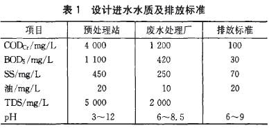 生產(chǎn)塑料助劑、粘合劑、印刷膠、光刻膠、電解液過(guò)程中排放的高濃度廢液有機(jī)污染物濃度極高, COD,可達(dá)十幾萬(wàn)甚至幾十萬(wàn),很難生化降解,除部分含二氧六環(huán)濃度極高的廢液外運(yùn)處理外,其余均進(jìn)預(yù)處理站廢液儲(chǔ)池。另外,塑料助劑、粘合劑、印刷膠、光刻膠、電解液生產(chǎn)過(guò)程排放的高濃度廢水中含有甲苯、酚、有機(jī)胺、二甲苯、二氧六環(huán)、大分子化合物、光穩(wěn)定劑及表面活性劑、有機(jī)聚合物等,可生化性較差,應(yīng)先對(duì)其進(jìn)行預(yù)處理,以降低有機(jī)污染物濃度,減輕對(duì)后續(xù)生化處理的負(fù)荷;貏(dòng)力系統(tǒng)正、反洗排水90 m3/d,pH 3~4,也必須先經(jīng)預(yù)處理單元調(diào)節(jié)pH,再與其他廢水混合送至化工基地廢水處理廠進(jìn)行二級(jí)處理?紤]企業(yè)今后的發(fā)展,廢水處理廠確定處理規(guī)模為2 000 m3/d,出水執(zhí)行《污水綜合排放標(biāo)準(zhǔn)》(GB 8978~1996)一級(jí)標(biāo)準(zhǔn),設(shè)計(jì)進(jìn)水水質(zhì)及排放標(biāo)準(zhǔn)見(jiàn)表1。