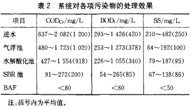 工程總投資861.81萬(wàn)元,運(yùn)行費(fèi)用為1.39元/甜,其中電費(fèi)1.09元/m3、藥劑費(fèi)O.12元/m3、人工費(fèi) 0.18元/m3。經(jīng)過(guò)該廢水處理系統(tǒng)處理后可大量削減污染物,減少對(duì)環(huán)境的危害,其主要污染指標(biāo)年消減量為(水量按滿負(fù)荷處理量2 000 m3/d,系統(tǒng)運(yùn)行按340 d/a):COD,748 t/a;BOD5 245 t/a;SS 116 t/a。