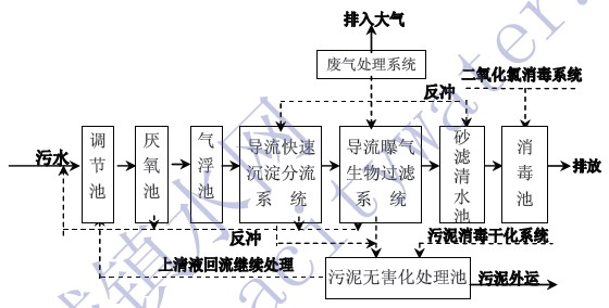 通過對(duì)已治理的污水檢測表明,該工藝有較好的處理效果。處理水水質(zhì)達(dá)到國家排放標(biāo)準(zhǔn)要求,即出水水質(zhì)CODcr≤80mg/L,BOD5≤20 mg/L、SS≤20 mg/L。 PH=6~9,動(dòng)植物油≤5 mg/L 色度<30;氨≤5 mg/L 、總磷≤0.5mg/L 、糞大腸菌數(shù)≤100 個(gè)/人。