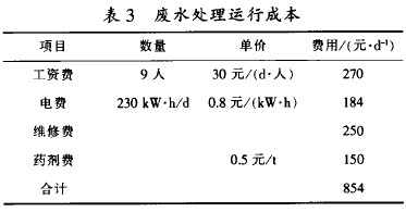 該廢水處理工程,包括各預(yù)處理及回用系統(tǒng)總廢水量300 t/d,工程總投資為249.2萬元,廢水處理成本見表3,單位處理運(yùn)行費(fèi)用2.85元/l,扣除水回用節(jié)約水費(fèi)及回收原料出售等收入,廢水處理成本為1.55元/t。
