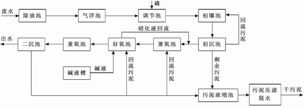 HSB/O-A-O-A 工藝系統(tǒng)主要由除油系統(tǒng)、初曝系 統(tǒng)和二段生化系統(tǒng)構(gòu)成。除油系統(tǒng)主要是對廢水中油 類物質(zhì)進(jìn)行去除, 減少油類物質(zhì)對微生物的毒害; 初 曝系統(tǒng)主要是對廢水進(jìn)行預(yù)處理, 為生物脫氮提供一 個合適穩(wěn)定的環(huán)境; 二段生化系統(tǒng)分為兼氧反硝化和 好氧硝化兩部分, 主要是對廢水進(jìn)行生物脫氮處理和 去除剩余污染物。