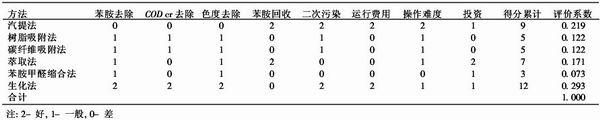 從1993年至1997年的4年中,為選擇較好的 治理方法,攻關(guān)小組先后進(jìn)行了汽提法、樹脂吸附 法、碳素纖維吸附法、萃取法、苯胺甲醛縮合法、超聲 波法和生化法試驗(yàn),試驗(yàn)定性結(jié)果見表1。