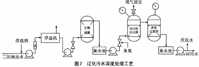 遼化聚酯一廠采用“浮選—生物過濾—臭氧催化氧化(OCOR)—快濾”(簡稱FBOF)工藝對(duì)聚酯廢水二沉池出水進(jìn)行深度處理,具體處理工藝流程如圖2所示。