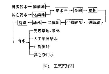 由于該酒店對環(huán)境質(zhì)量要求較高,要求新建的凈化站不產(chǎn)生噪音、不散發(fā)臭味,以確保周圍環(huán)境衛(wèi)生良好;同時考慮到污水處理站建成后運行管理簡便、運行費用低等因素,因此采用了噪音低、易管理的以生物轉(zhuǎn)盤為主體的生化處理方法,其工藝流程見圖1。