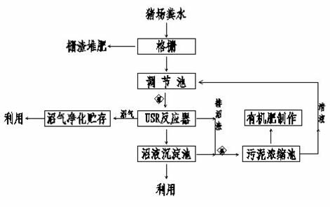 2、調(diào)節(jié)池內(nèi)糞水經(jīng)泵提升進入USR產(chǎn)生沼氣、沼液及沼渣;