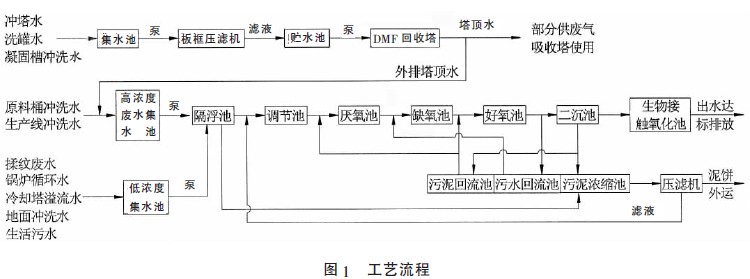 合成革企業(yè)在生產(chǎn)中產(chǎn)生的廢水因其生產(chǎn)品種的不同而異, 種類多, 成分復(fù)雜, 其排放周期和水量也因其產(chǎn)品質(zhì)量的要求不同各異, 其濃度也因各自具體操作的不同而有較大差異。根據(jù)我們對多家合成革企業(yè)現(xiàn)場情況的調(diào)查, 廢水主要分為低濃度廢水和高濃度廢水。低濃度廢水主要來源于揉紋車間揉紋廢水、車間地面沖洗水、廠區(qū)路面沖洗水及廠區(qū)生活污水。高濃度廢水主要來源于干、濕法生產(chǎn)線原料桶清洗廢水、生產(chǎn)線沖洗水、DMF (二甲基甲酰胺) 回收塔冷凝水(亦即塔頂水)、回收塔的定期沖洗水、濕法生產(chǎn)線的凝固槽沖洗水以及儲罐沖洗水。