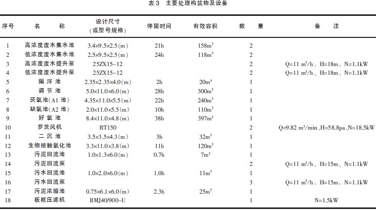 ③除高、低濃度廢水集水池外, 其余構(gòu)筑物采用一體化鋼筋混凝土結(jié)構(gòu), 將各個子單元有機結(jié)合在一起, 使占地面積減少, 安裝簡便。