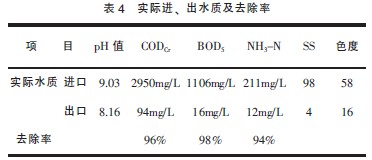 該廢水處理工程于2008 年4 月12 日開始調(diào)試, 5 月26 日出水各項指標(biāo)達到設(shè)計標(biāo)準(zhǔn), 現(xiàn)在運行狀況穩(wěn)定, 通過6 月~10 月加權(quán)平均統(tǒng)計, 實際進、出口水質(zhì)及去除率見表4。
