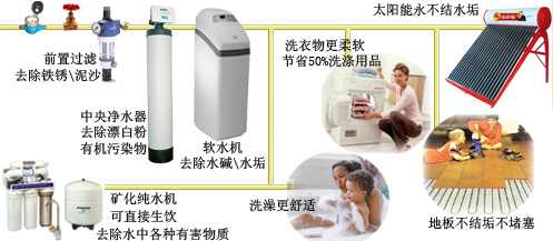 全屋凈化,全屋的水都達到凈化效果,所有出水口的水都達到凈化和軟化的效果,使用方便處理效果明顯,是高檔公寓和別墅的理想方案! 可選擇設備:前置過濾器+中央凈水機+軟水機+純水機+管線機