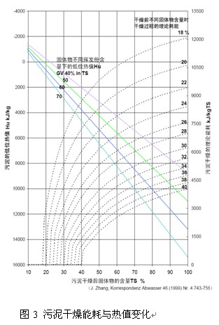 圖3給出污泥干物質(zhì)中不同揮發(fā)性固體物含量與污泥干物質(zhì)含量及污泥低位熱值的相關關系。計算中假設灼燒揮發(fā)份的熱值為22,000KJ/Kg,圖中還標出了污泥干燥時不同初始干物質(zhì)含量及干燥后干物質(zhì)含量與干燥所需最小理論熱量。