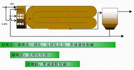 該技術(shù)可根據(jù)污水水質(zhì)的不同,組合成不同比例的厭氧釋磷區(qū)-反硝化吸磷區(qū)-缺氧(厭氧)區(qū)-好氧區(qū)-缺氧區(qū)-好氧區(qū)。碳通過好氧微生物的同化和異化作用去除,氮通過好氧硝化菌的硝化作用、兼氧反硝化菌的反硝化作用去除,磷通過聚磷菌厭氧釋放、好氧超量吸收去除。