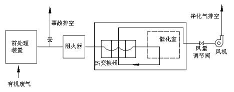有機廢氣經(jīng)前處理后,經(jīng)過阻火器,進入熱交換器,使廢氣升溫到催化反應(yīng)溫度(250-300℃)。然后進入催化反應(yīng)床,在催化劑的作用下,有機廢氣進行氧化反應(yīng)生成無害的水和二氧化碳,并放出一定的熱量。反應(yīng)后的高溫氣體再次進入熱交換器,經(jīng)換熱冷卻,最后以較低的溫度經(jīng)引風(fēng)機排入大氣。