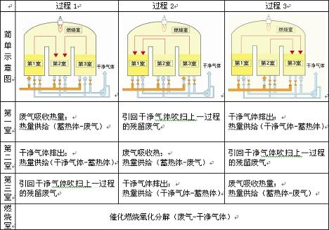 有機廢氣經(jīng)鼓風(fēng)機進入燃燒爐,由燃料燃燒加熱,升溫至250~300℃左右。在此溫度下,廢氣里的有機成分在催化劑的作用下被氧化分解為二氧化碳和水,反應(yīng)后的高溫?zé)煔膺M入特殊結(jié)構(gòu)的陶瓷蓄熱體,絕大部分的熱量被蓄熱體吸收(95%以上),溫度降至接近進口的溫度后經(jīng)煙筒排放。通常情況下,燃燒爐由三個蓄熱室構(gòu)成,廢氣在PLC程序的控制下,循環(huán)執(zhí)行以下的操作流程:進入已蓄熱的蓄熱室,使廢氣得到預(yù)熱,然后進入燃燒室,處理的廢氣經(jīng)未蓄熱的蓄熱室放熱后排放,一部分處理后的氣體被引回到第三室,吹掃其中殘留的未處理廢氣。在污染物去除效率要求不高的情況下,為節(jié)省資金,也可設(shè)計成兩室結(jié)構(gòu)。