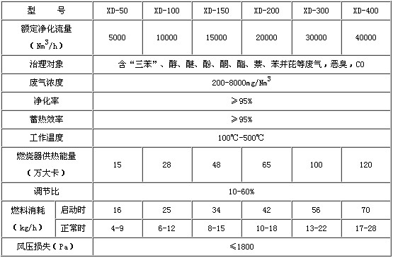 表1 XD型蓄熱式催化燃燒爐系列設(shè)備規(guī)格表