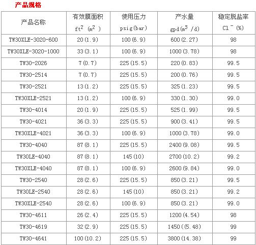 1、產(chǎn)水量和脫鹽率是基于測試條件: TW30 元件, 2,000ppm NaCl ; LE , XLE 元件, 500ppm NaCl ;操作壓力如上表,水溫 77°F ( 25 ℃ ) 回收率如下: TW30-2026 10% ; TW30-2521, XLE-2521 TW30-4021, XLE-4021 8%; TW30-2514, TW30-4014 5%; 其它膜元件的回收率為 15%;