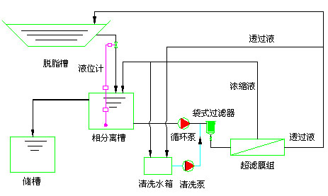 在涂裝前處理脫脂去油工序中,鋼材表面的防銹油、機(jī)油等,除動植物油被堿皂化外,大多被脫脂液中的表面活性劑乳化于脫脂液中,當(dāng)它們含量過高,就會析出,從而影響以后的脫脂效果。因此要求脫脂液中含油量不超過4g/L。如果靠排放更新脫脂液,不但不經(jīng)濟(jì),還會帶來大量污水處理問題。安得公司(其前身為美國AMT公司北京辦事處)在膜法水處理中具有豐富的經(jīng)驗和成熟的技術(shù),它采用超濾膜法使生產(chǎn)線上脫脂含油廢水分離得以實現(xiàn)。其油水分離工藝流程圖如圖3-1。超濾法脫脂法主要是利用超濾原理對乳化液進(jìn)行破乳,利用超濾膜對脫脂液進(jìn)行含油部分的濃縮,使油在特定的容器中不斷富集,而經(jīng)過處理的脫脂液中已不含有油的的成份,直接返回脫脂槽,從而降低脫脂槽中油的含量。隨著科學(xué)技術(shù)的發(fā)展,超濾膜分離法在乳化液中的“破乳”作用的優(yōu)點越來越被人們接受。由于超濾膜得透過液中油的含量可由原液的100~1000ppm下降為10ppm,由此可看到超濾技術(shù)所起到的作用,同時由于超濾裝置在清洗時不需要大量的化學(xué)藥劑,因此在國外已大量用于污水處理工藝中.