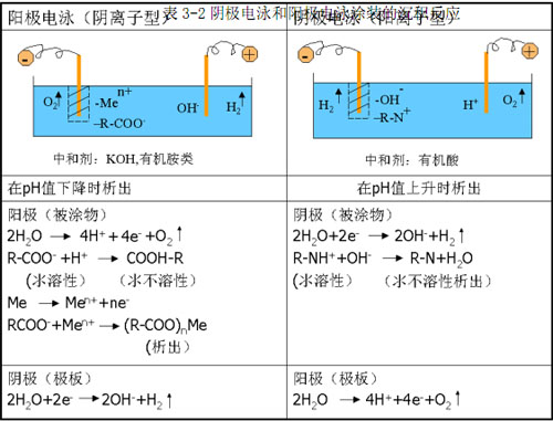 電泳涂裝過程伴隨著電解、電泳、電沉積和電滲等四種電化學(xué)物料現(xiàn)象。陰極電泳和陽極電泳涂裝沉積反應(yīng)如表3-2。