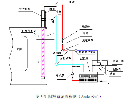 在電泳中采用陽極系統(tǒng),它通過使用選擇型的、單向的半透膜來有效地除去電泳涂裝過程中產(chǎn)生的有機(jī)酸,維持系統(tǒng)的化學(xué)平衡。陽極系統(tǒng)是由數(shù)個電極、離子選擇膜、極液槽、極液循環(huán)管路、泵、電導(dǎo)控制系統(tǒng)、去離子水系統(tǒng)等組成,其工藝流程如圖3-3。