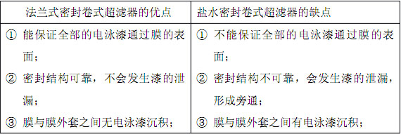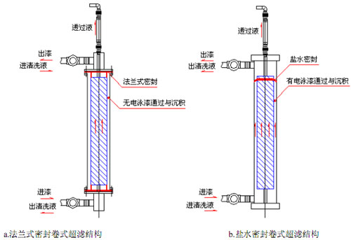 超濾器的透過量主要取決于有效膜面積的大小,在電泳涂裝工藝中,卷式超濾器以其最大的膜面積,最小的組件體積以及最小的系統(tǒng)投資而被廣泛應(yīng)用,而法蘭式卷式超濾器的應(yīng)用使這一應(yīng)用更為普及。法蘭式超濾器與的鹽水密封式卷式超濾器結(jié)構(gòu)圖如圖3-6,表3-3為其優(yōu)缺點的比較。