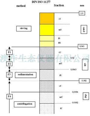 根據(jù)stokes’定律,大顆粒的沉降速度較快,小顆粒的沉降速度較慢,把土壤樣品放到液體中制成一定濃度的懸浮液,懸浮液中的顆粒在重力作用下將發(fā)生沉降,因此可以根據(jù)不同粒徑的顆粒在液體中的沉降速度不同來測(cè)量粒度分布。具體方法為移液管法:將土壤樣品有機(jī)質(zhì)去除,然后將過篩(0.05mm)后的細(xì)土10g放入1000ml焦磷酸鈉溶液中,用移液管在不同深度不同時(shí)間內(nèi)緩慢吸取一定量的懸浮液樣品,烘干后稱重,即可算出不同粒徑范圍的土壤粒徑分布百分比。土壤粒徑分布?xì)W洲標(biāo)準(zhǔn)(DIN ISO 11277)分為4級(jí)(F1、F2、F3、F4),美國標(biāo)準(zhǔn)(ASTM)分為兩級(jí)(F1和F2),具體分級(jí)情況如下: