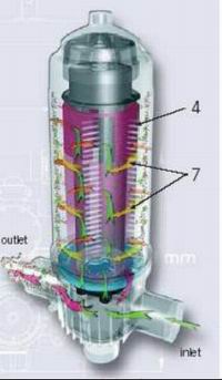 經(jīng)過離心分離后的水,從疊片組(4)的外邊緣向里經(jīng)過溝槽,收集到中心凈水室中,然后從凈水室底部中心出口(6)流出。疊片組經(jīng)由濾芯頂部的活塞(5)中的彈簧壓緊。雜質(zhì)則被攔截在特別設(shè)計疊片的外緣和溝槽里面不同深度的交叉處。