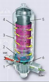 水進(jìn)入過濾器后,水流經(jīng)過濾芯底部的渦流螺旋盤(2)上的渦旋葉輪時,水流被加速旋轉(zhuǎn),產(chǎn)生強(qiáng)大的“離心”作用,使得水中比重較大的顆粒(3)遠(yuǎn)離疊片外緣,被甩到到濾筒內(nèi)壁上在上升的水流作用下,集中到過濾器的頂部。這樣,進(jìn)入濾芯的水中的雜質(zhì)就大大減少,從而減少了疊片的清洗頻率,達(dá)到減少污水排放的效果。