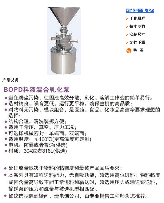 料液混合乳化泵:避免粉塵污染,使固液高效分散、乳化、溶解工作變得簡單易行。選材精良,噪音更低,運行更平穩(wěn),確保整機的高品質(zhì)。對物料無污染,模塊組合,是醫(yī)藥、食品、化妝品等高潔靜要求的理想選擇。