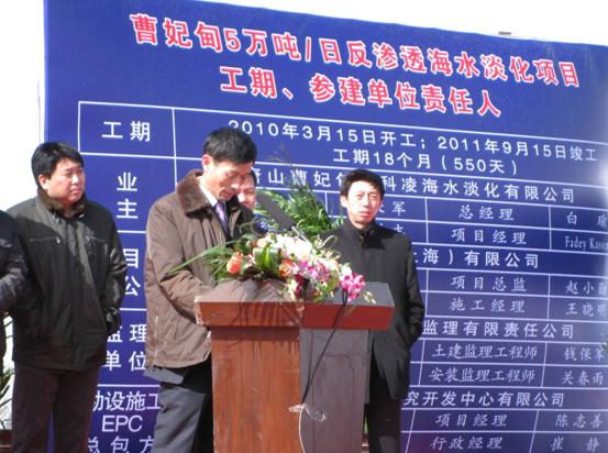 2010年3月15日上午10:00點(diǎn),曹妃甸阿科凌日產(chǎn)五萬噸膜法海水淡化項(xiàng)目開工儀式在工地現(xiàn)場(chǎng)舉行。唐山市副市長(zhǎng)唐文弘、阿科凌公司董事長(zhǎng)Bernt、唐山基礎(chǔ)投資建設(shè)有限公司總經(jīng)理劉東、杭州水處理中心董事長(zhǎng)鄭根江等諸家單位領(lǐng)導(dǎo)參加了開工儀式,儀式由曹妃甸管委會(huì)副主任朱越杰主持。