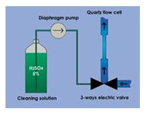 每臺儀器都有自動清洗系統(tǒng)。系統(tǒng)基本校訂一天自動清洗一次,使用低廉的清洗溶液(即5%硫酸溶液),自動注入樣品流通池中進(jìn)行清洗。