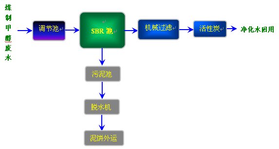 由于煤制甲醇污水NH3-N含量較高,故選用適于降解高含量NH3-N的SBR工藝。 煤制甲醇污水通過(guò)調(diào)節(jié)池進(jìn)入SBR生化池,去除大部分COD、NH3-N和懸浮物等,再通過(guò)機(jī)械過(guò)濾,去除懸浮物和少量COD,出水通過(guò)活性炭進(jìn)一步處理后,可以做為循環(huán)水,也可以用于綠化和澆灑道路等。