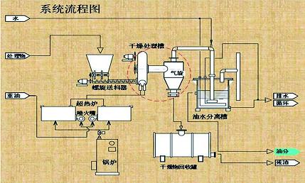 通過鍋爐產生的過熱蒸汽(50 0℃ ),經特別的噴嘴以兩馬赫速度噴出,與油泥顆粒正面碰撞,在高溫及告訴所產生的沖量作用下,將油泥中所吸附或包含的油份和水分蒸出,蒸汽冷卻后實現(xiàn)油水分離,原油可直接回收,廢渣中油份大部分被除掉,廢渣中含油率最低可達0.08%。